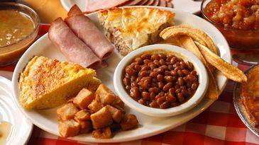 Œufs brouillés, jambon, saucisses, fèves au lard, petites patates au four, (toast), crêpes garnies de sirop d’érable.